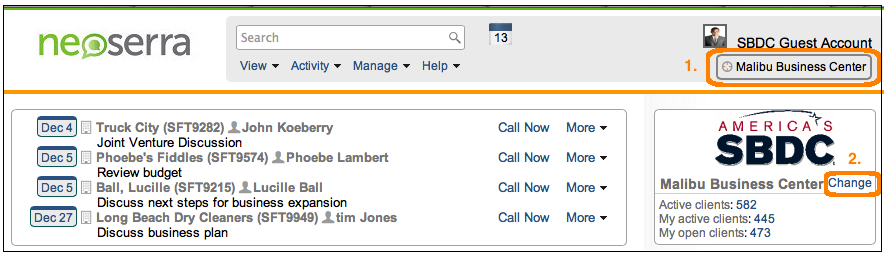 Note:Clicking View|Centers displays a list of centers configured for your Neoserra database, however, this does not provide access to the clients associated with the other centers. You will need to change centers using the link provided in the banner to see the clients and the activity associated with the new center.