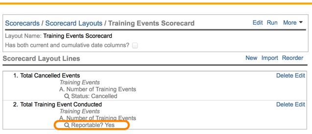 The first line item is looking for all cancelled events. By default all cancelled events are non-reportable. Therefore, to run this scorecard we need to uncheck the Restrict to only reportable records? field on the definition record. However, for the second line item we don't want to include the non-reportable records, so we have to add a "Reportable = Yes" filter to this second line item calculation. This filter is only required if/when the Restrict to only reportable records? checkbox is unchecked.