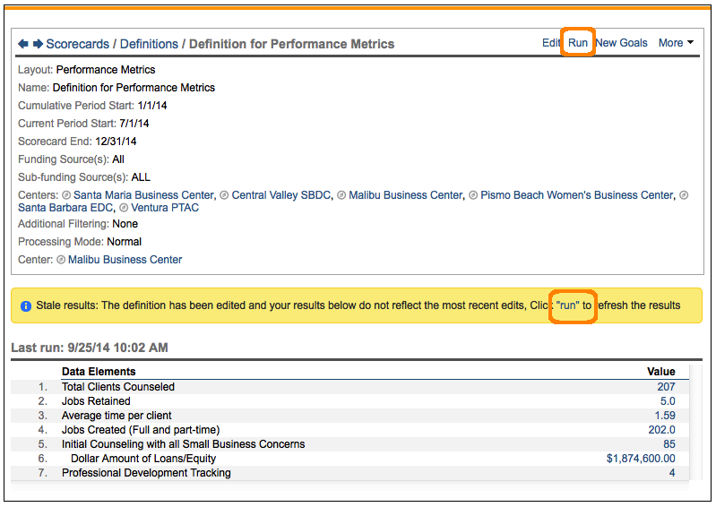 In fact, as shown above, there may even be two "Run" links presented on the screen. The "Run" link at the top of the screen is always available, but the "Run" link in the yellow ribbon will appear when Neoserra detects that the definition is out of date.