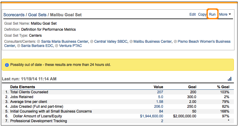 As shown in the following graphic, scorecards can also be generated from their associated goal records. When generating a scorecard from a goal record, you see not only the data in the Neoserra database, but also a comparison of this current data against set goals.