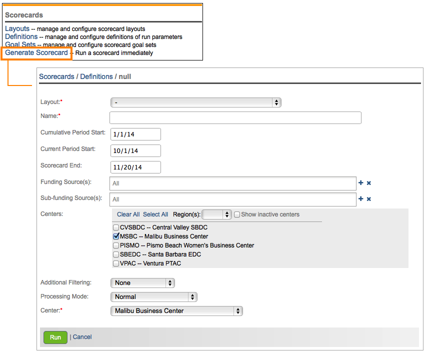 You cannot run a scorecard until you have established its run parameters. These run parameters include date range(s); record filters such as funding source and center; and processing mode. A set of run parameters can either be entered on the fly for a one-time generation of a particular scorecard, or it can be saved as a scorecard definition record and used repeatedly to run a scorecard.
